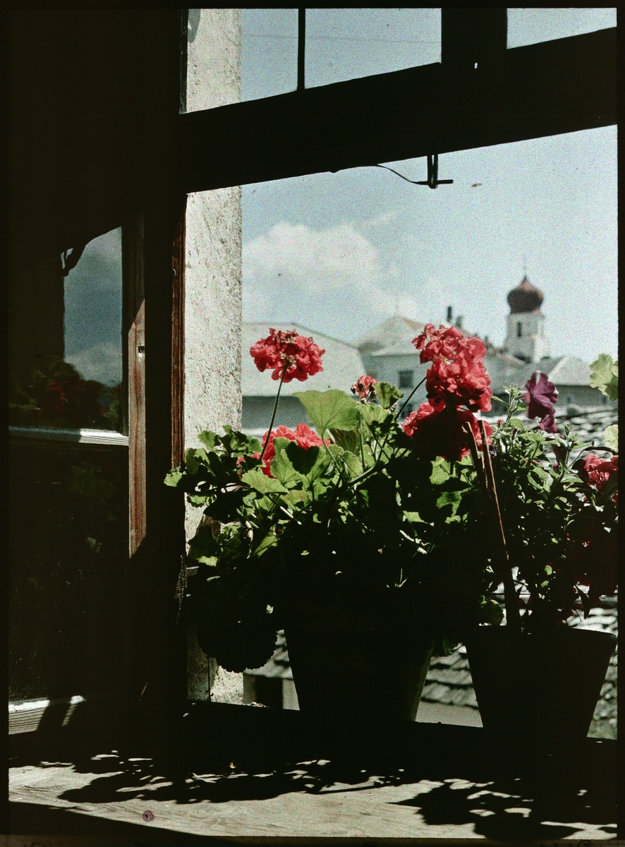 Agfa-autokrom. Fönster med pelargoner. "Blik auseinem Bauemhaus in Layen?".