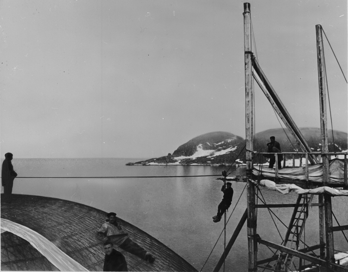 Kontroll av ballongsömmarnas täthet med hjälp av vita linneremsor indränkta i blyacetat.