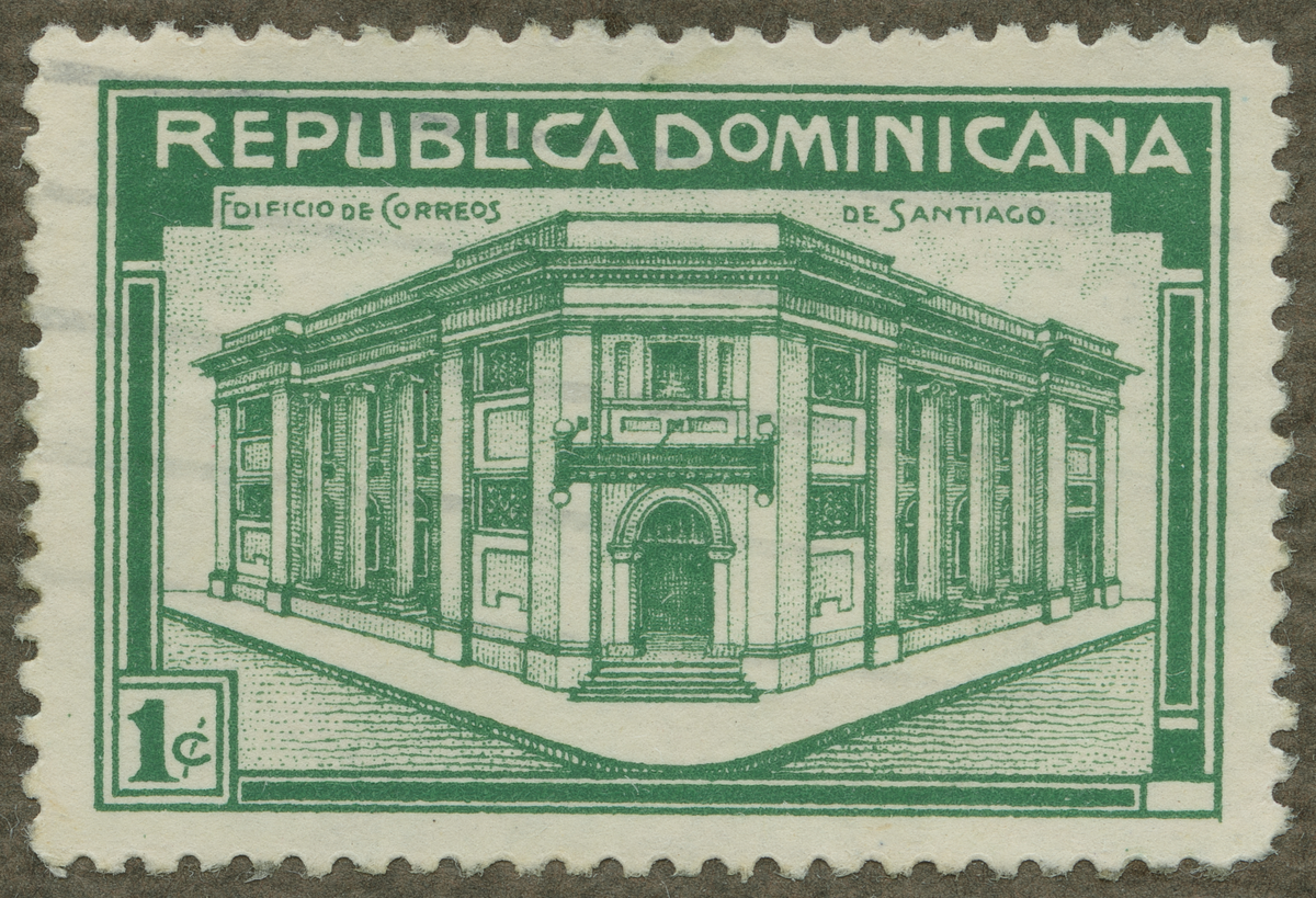 Frimärke från Dominikanska republiken, 1936. Motiv av Postbyggnaden i staden Santiago