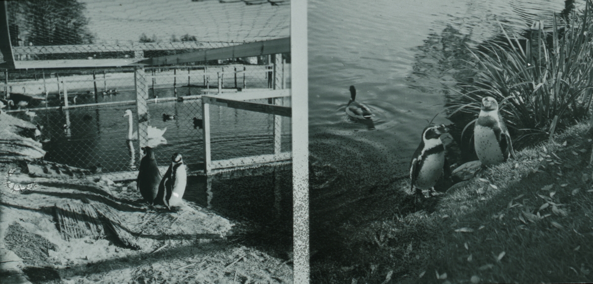 Fotografi från Grönland. Stereobild med motiv av pingviner i grässlänt vid vatten.