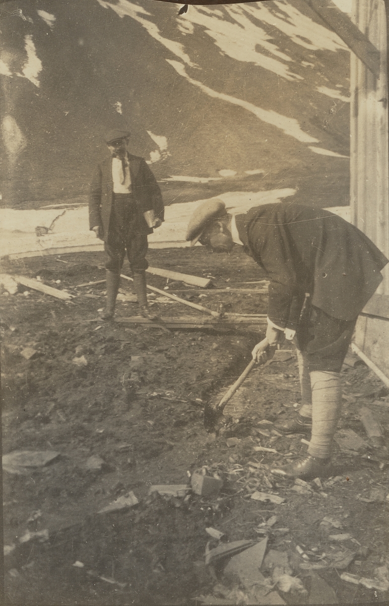 Fotografi från expedition till Spetsbergen. Motiv av en man som gräver i jorden utanför ett hus medan en annan man med pipa i munnen tittar på. Fotografi från expedition till Spetsbergen.