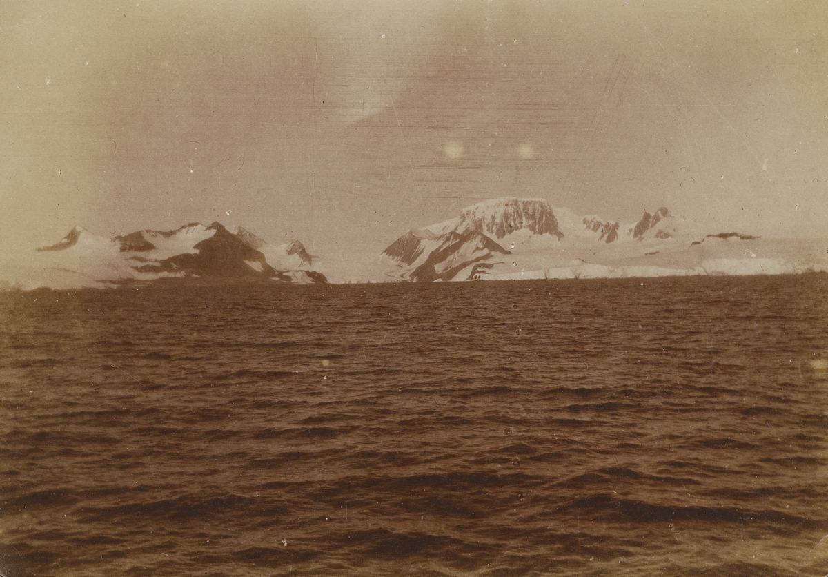 Fotografi från första svenska Antarktisexpeditionen 1901-1904. Vy över hav och snötäckta berg.