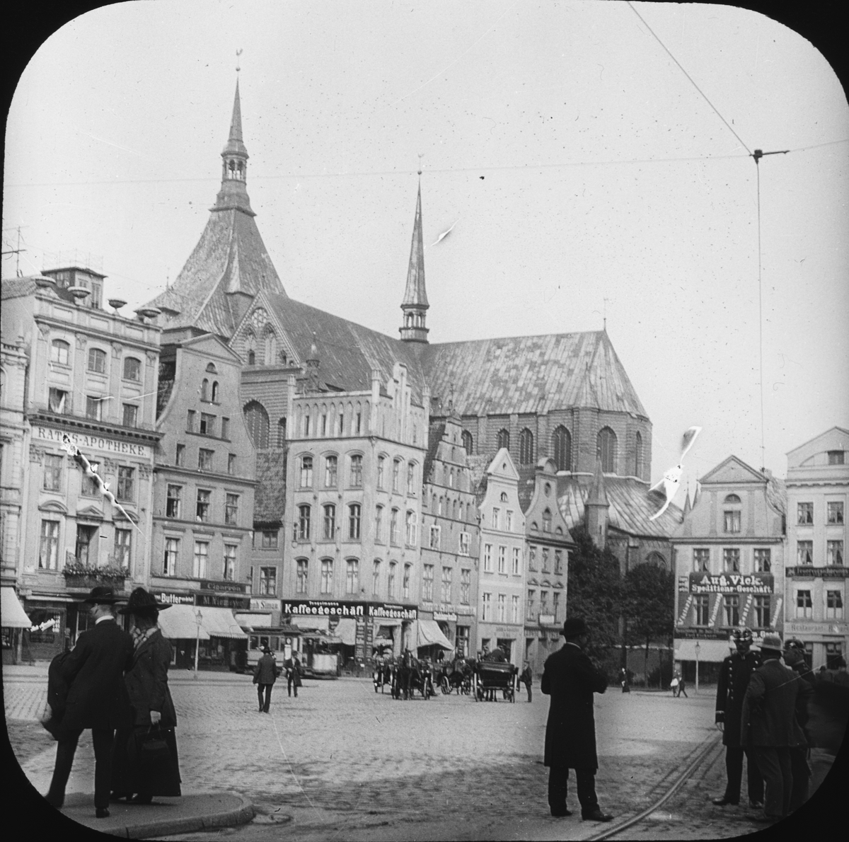 Skioptikonbild med motiv av torg i Rostock med St. Marien Kirche i bakgrunden.