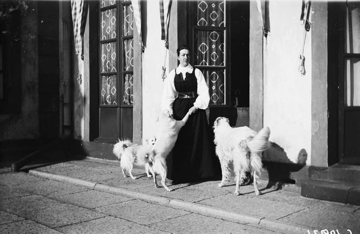 Drottning Victorias bilder. Drottning Victoria med tre hundar, iförd Tullgarnsdräkt på Tullgarns slott.