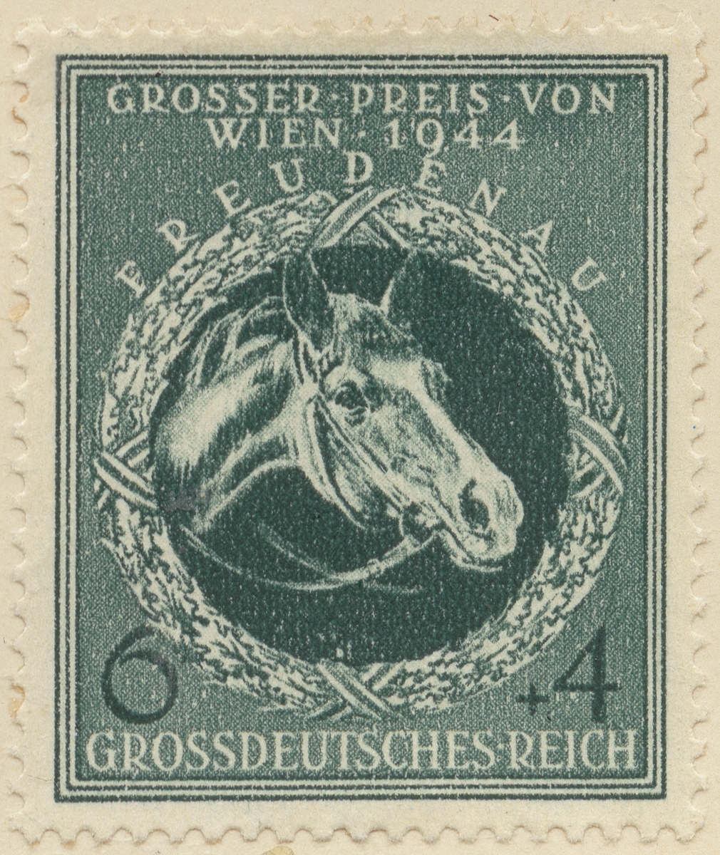 Frimärke ur Gösta Bodmans filatelistiska motivsamling, påbörjad 1950. Frimärke från Tyskland, 1944. Motiv av Kapplöpningshäst "Stora Priset i Wien"