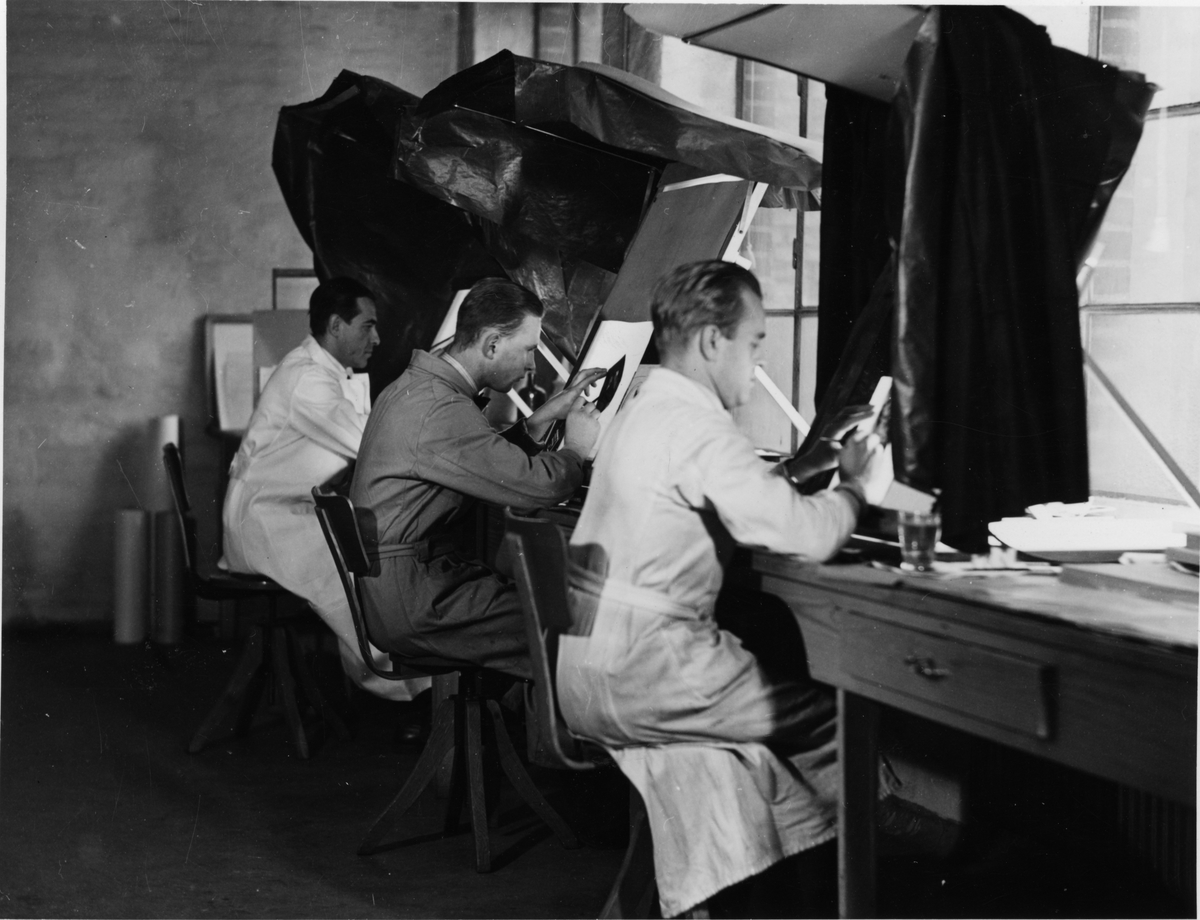 AB Defs djuptryckeri i Malmö. Retuschörer i arbete med negativ- och positiv retusch.