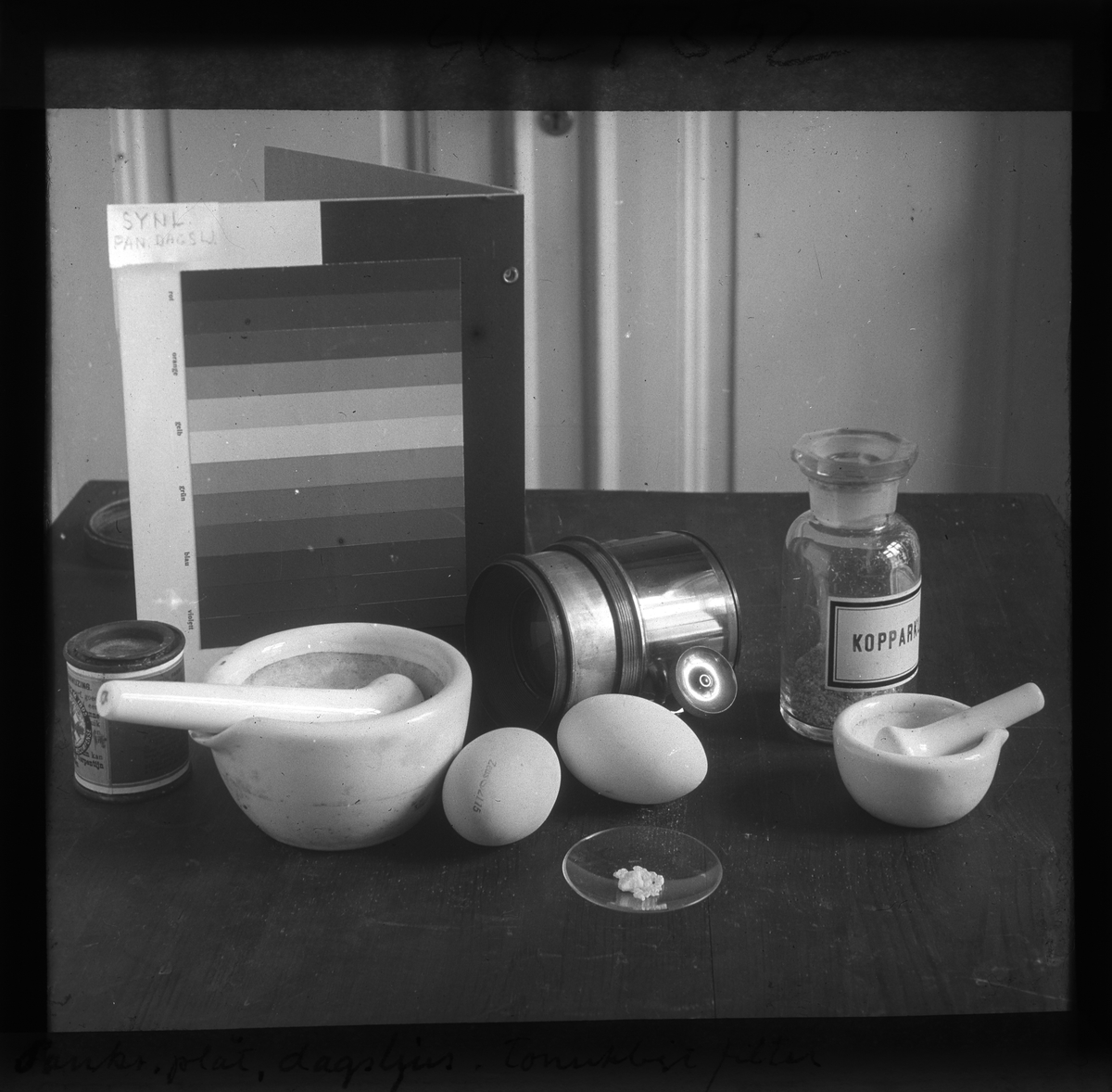 Skioptikonbild från Institutionen för fotografi vid Kungliga Tekniska Högskolan. Använd av professor Helmer Bäckström som föreläsningsmaterial. Bäckström var Sveriges första professor i fotografi vid Kungliga Tekniska Högskolan i Stockholm 1948-1958.
