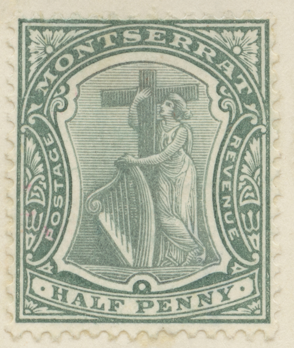 Frimärke från Brittiska Västindien, Montserrat, 1903. Motiv av symboler: Harpa och kors.