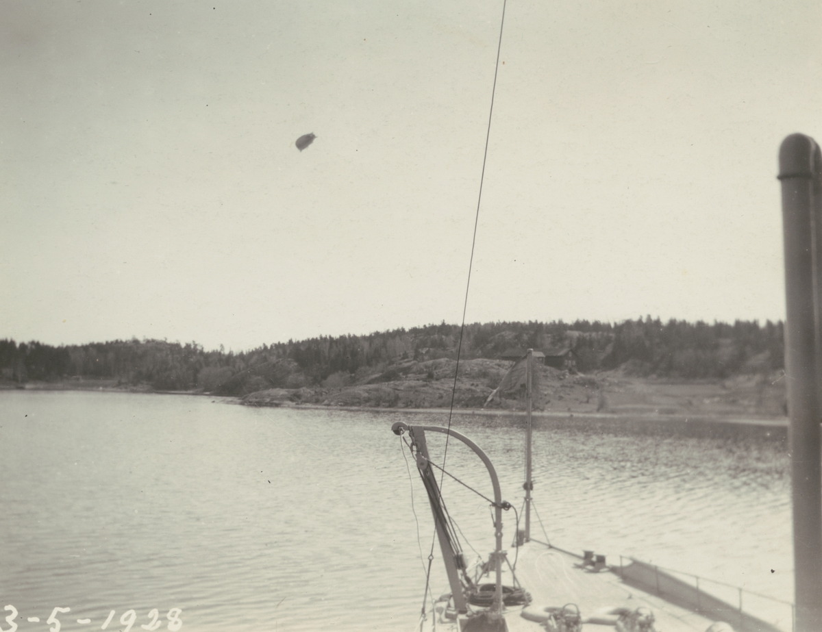 Fotografi från svenska undsättningsexpeditionen 1928. Motiv av luftskeppet Italia som passerar Hårsfjärden på väg mot Nordpolen.