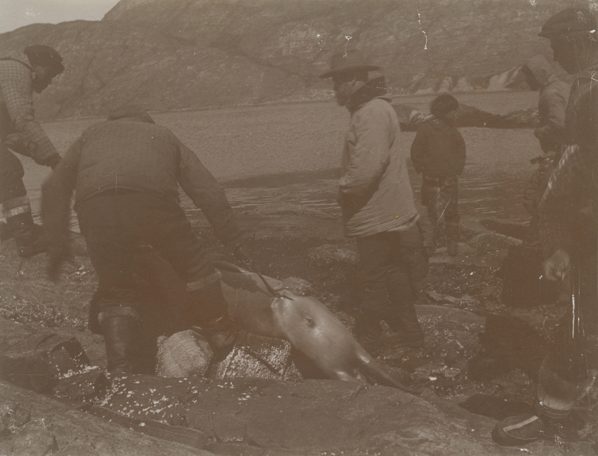 Fotografi från expedition till Grönland. Motiv av ett antal män som förbereder en sälslakt. En av männen har huggit en sälkrok i sälens buk.