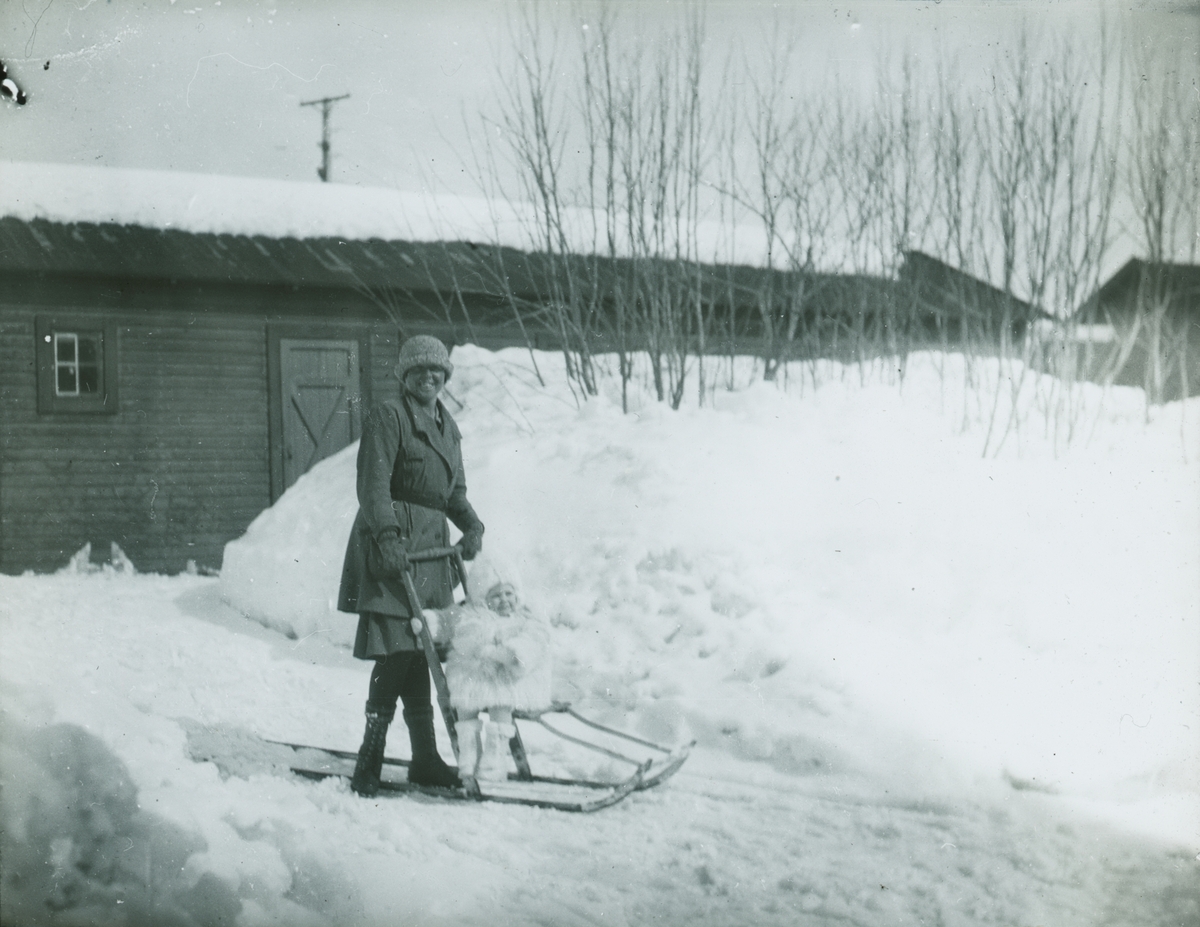 Fotografi från expedition till Spetsbergen. Motiv av kvinna och barn på kälke i snö.