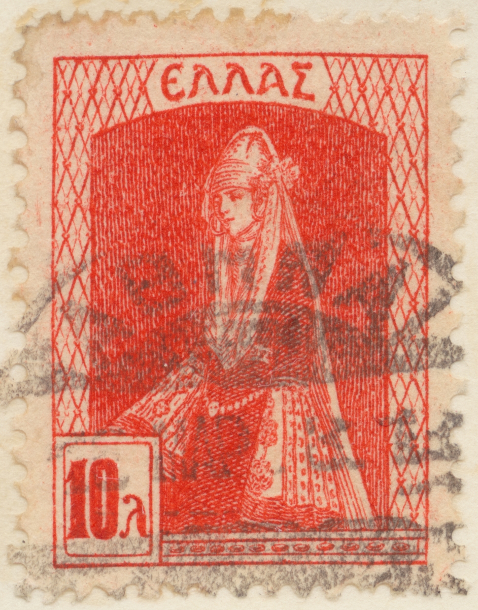 Frimärke från Grekland, 1927. Motiv av dräkt från Dodekanosöarna.