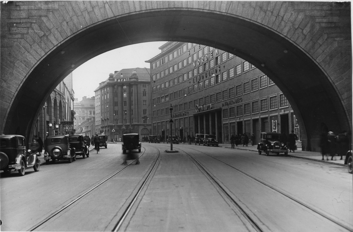 Brovalv över Kungsgatan mot väster, Stockholm, 1934. Till höger "Centrumhuset" uppfört 1929-31.