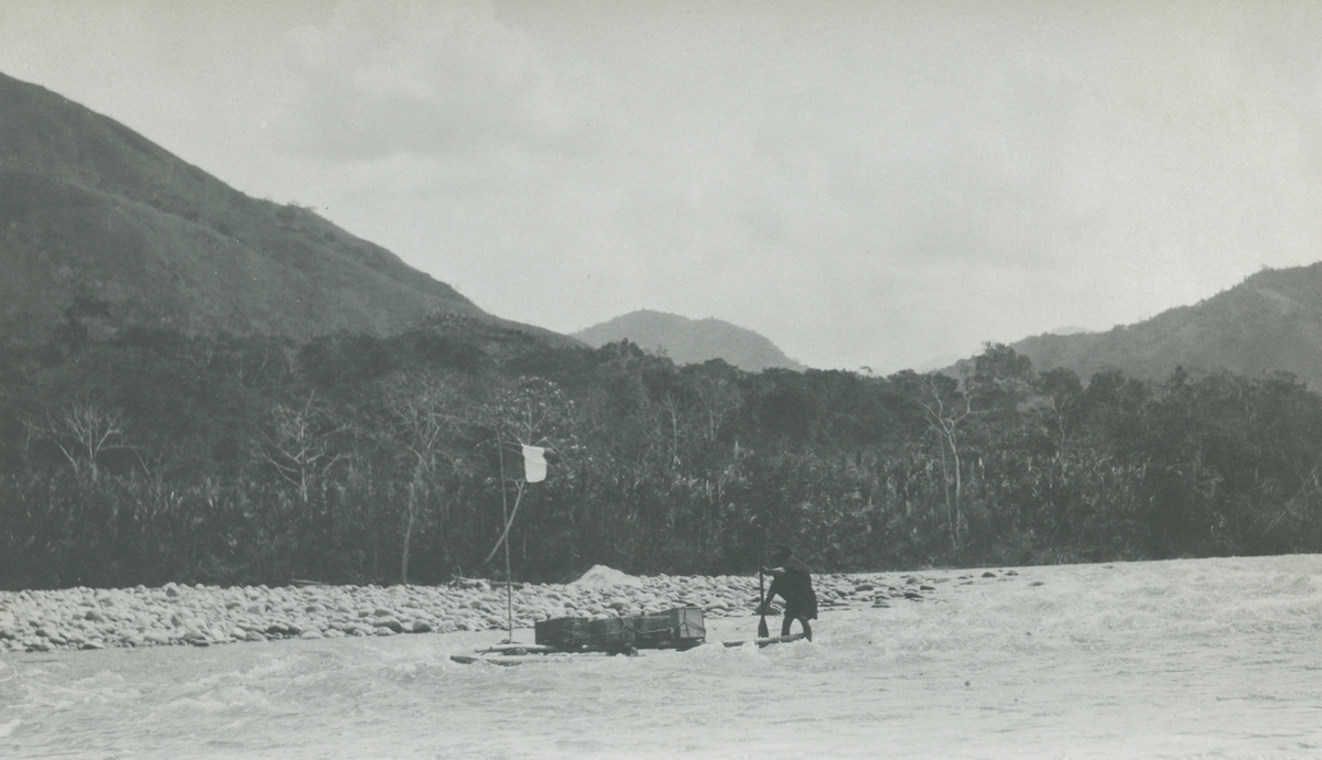 Fotografi från expedition till Peru 1920. Motiv av man på flotte i flod i djungeln.