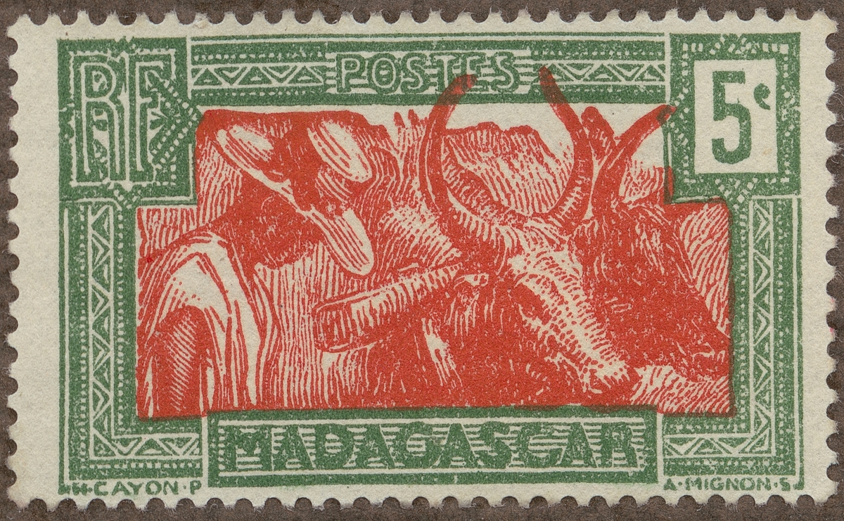 Frimärke ur Gösta Bodmans filatelistiska motivsamling, påbörjad 1950. Frimärke från Madagascar, 1930. Motiv av Zebuoxar som dragare Afrika