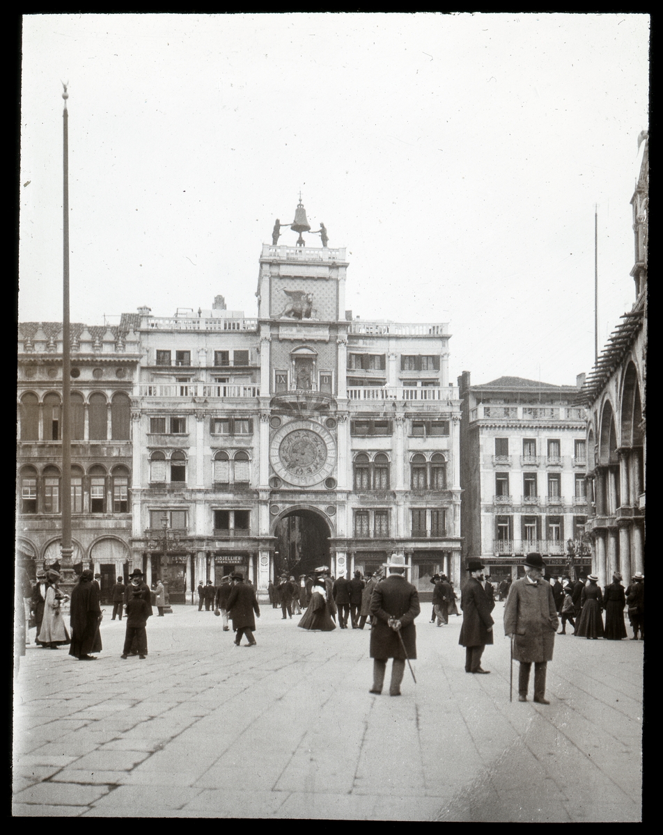 Skioptikonbild från institutionen för fotografi vid Kungliga Tekniska Högskolan. Motiv föreställande öppen plats i Venedig. Bilden är troligen tagen av John Hertzberg under en resa i Europa.