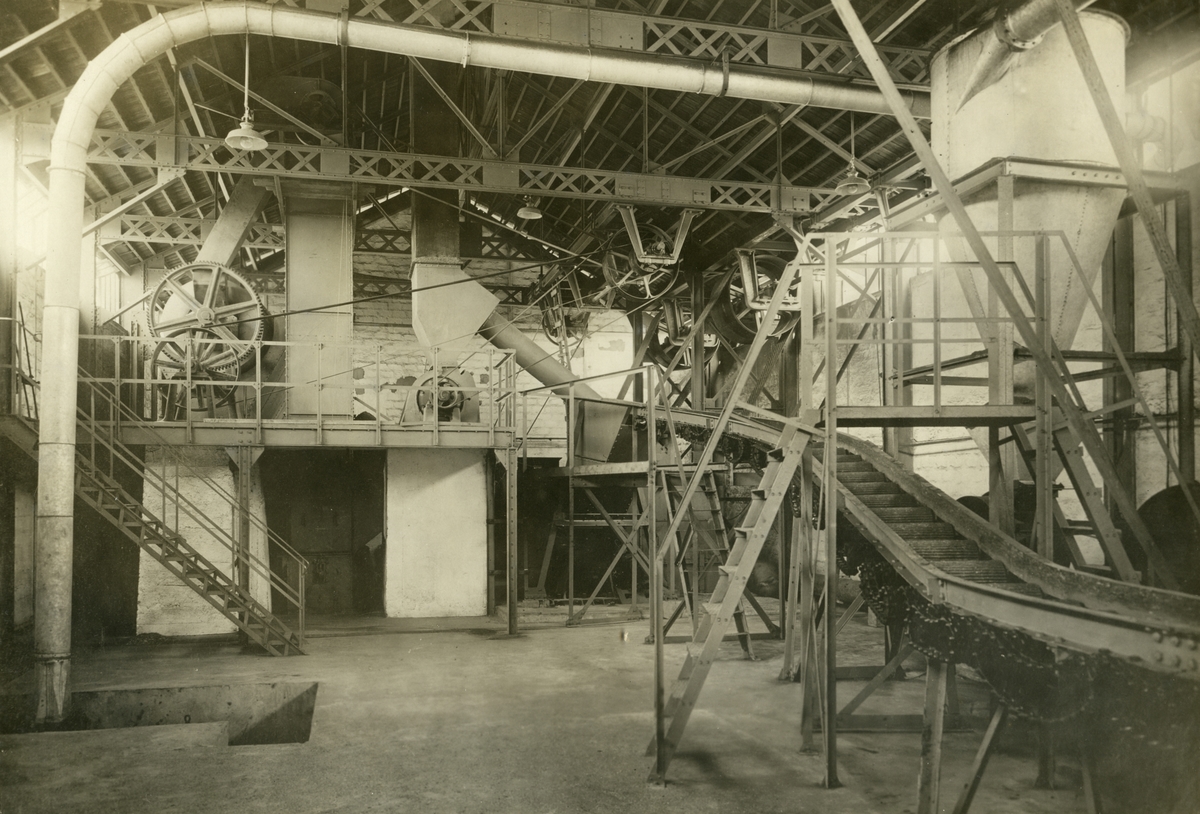 Interiör från pappersbruket S.A. Saint Freres, Frankrike. Maskineri för rengöring av trä. Ur album för KMW. AB Karlstads Mekaniska Werkstad.