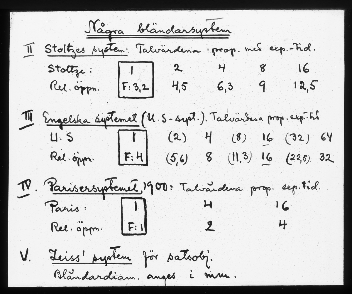Skioptikonbild från Institutionen för fotografi vid Kungliga Tekniska Högskolan. Använd av professor Helmer Bäckström som föreläsningsmaterial. Bäckström var Sveriges första professor i fotografi vid Kungliga Tekniska Högskolan i Stockholm 1948-1958.