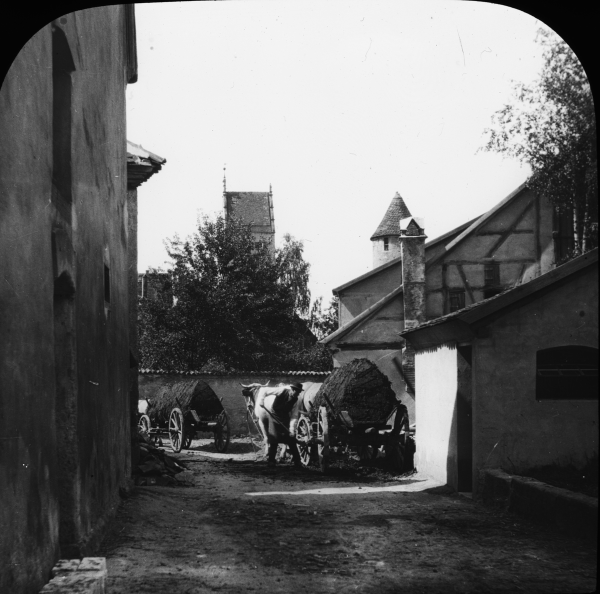 Skioptikonbild med motiv från Dinkelsbülh. Man lastar jord på kärra dragen av oxe.