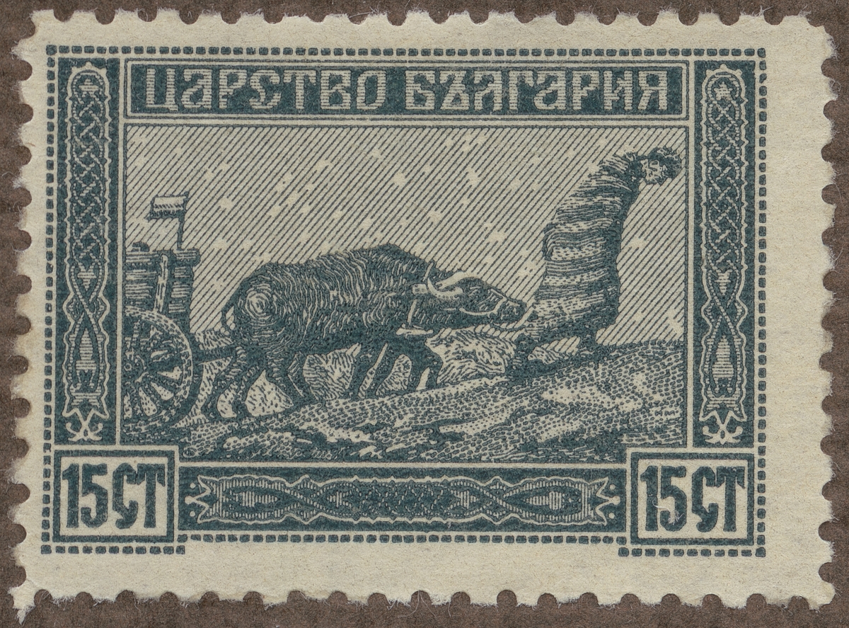 Frimärke ur Gösta Bodmans filatelistiska motivsamling, påbörjad 1950. Frimärke från Bulgarien, 1917. Motiv av Bulgarisk oxkärre "Minne av Macedoniens befrielse"