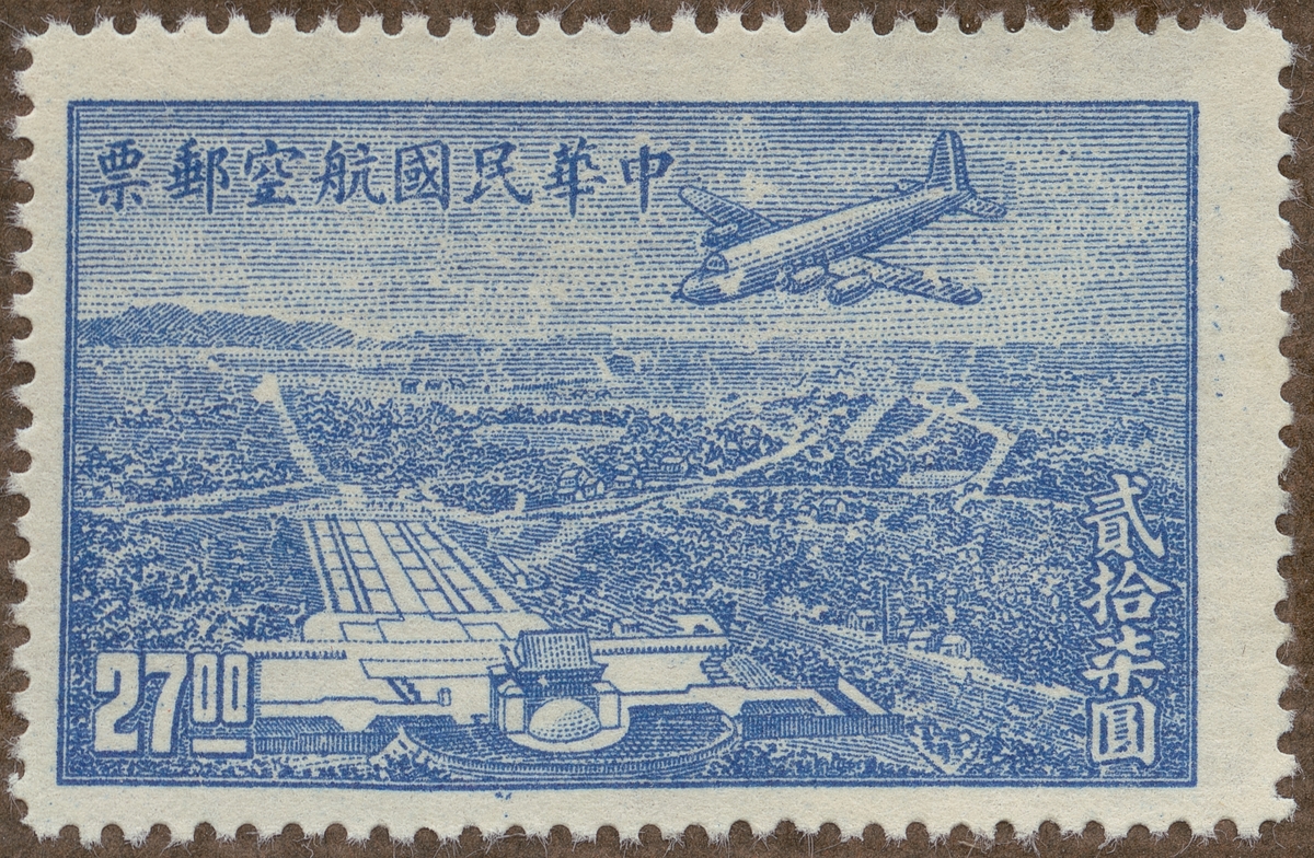 Frimärke från Republiken Kina, 1946. Motiv av Fyrmotorigt monoplan över Dr. Sun Yat-sen:s mausoleum, Kinas första president: 1866-1925.