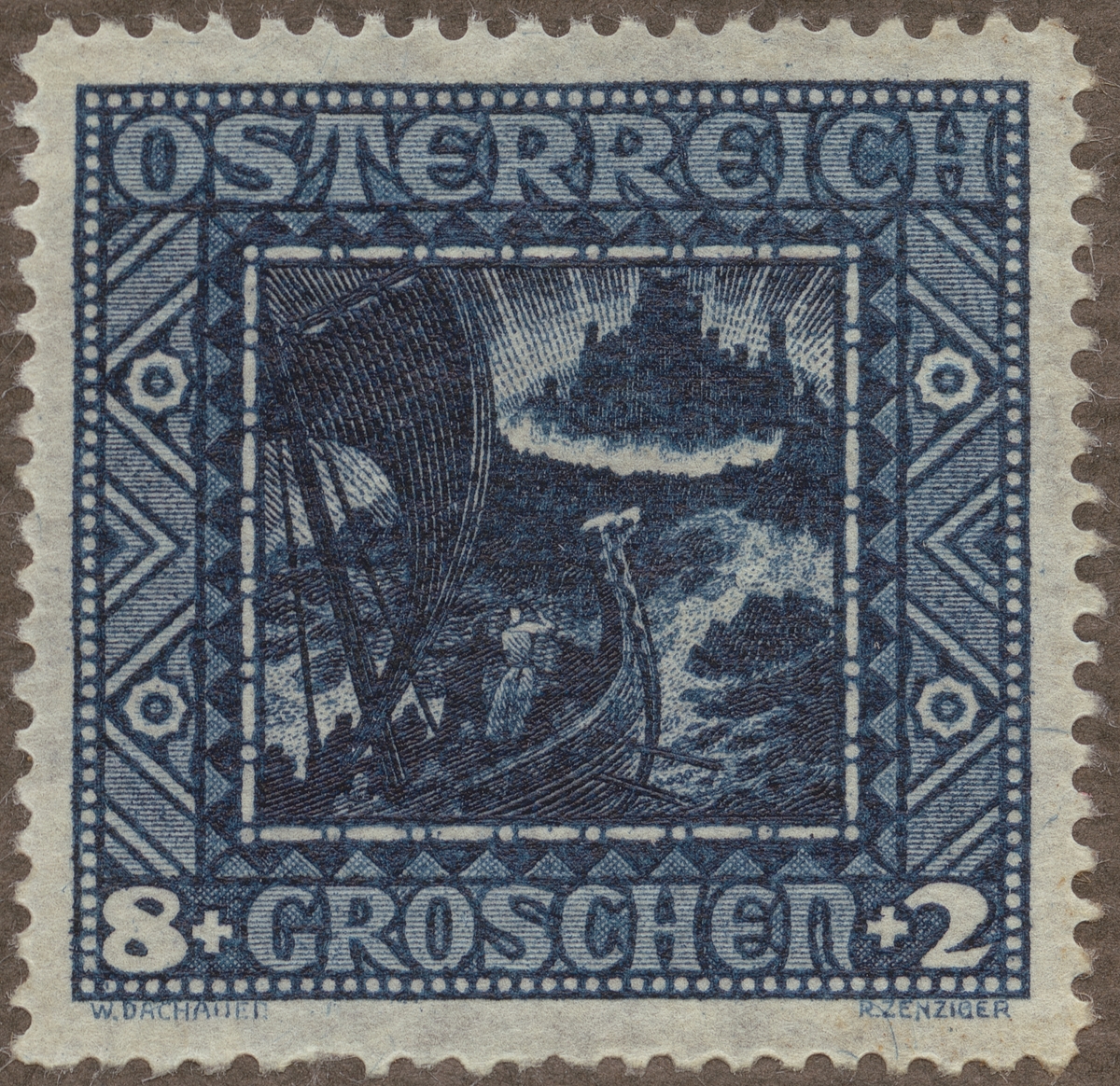Frimärke från Österrike, 1926. Motiv av Vikingaskepp: Kung Gunther (Eddakvädets Gunnar) seglar till Island. - Ur Nibelungendramat: tyska medeltidslitteraturens stora folkepos- 1100 talet "-Serie till förmån för barnvården-"