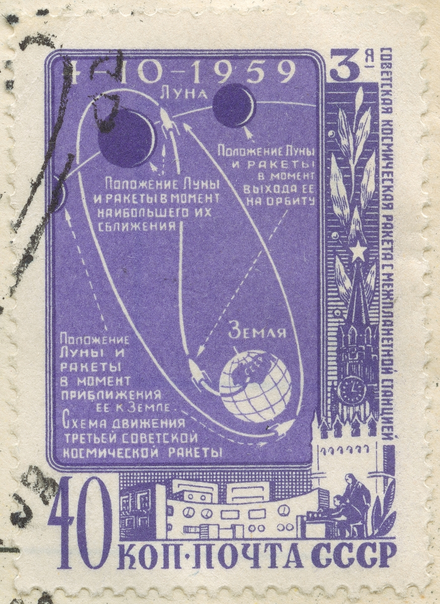 Frimärke från Ryssland, 1959. Motiv av Uppskjutning av Sovjets tredje månraket 4 oktober 1959 och LUNA 3 satelliten. Raketens uppskjutningsbana och satellitens omloppsbana runt månen, månpositioner och nymåne. LUNA 3 satelliten fotograferade månens baksida den 7 oktober. Bilderna visar 75% av den från jorden osynliga baksidan. Via TV-teknik sändes bilderna ned till jorden.