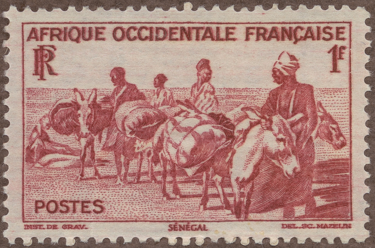 Frimärke ur Gösta Bodmans filatelistiska motivsamling, påbörjad 1950. Frimärke från Franska Västafrika, 1947. Motiv av Mulåsnetransport i Afrika "-(Sénégal)-"
