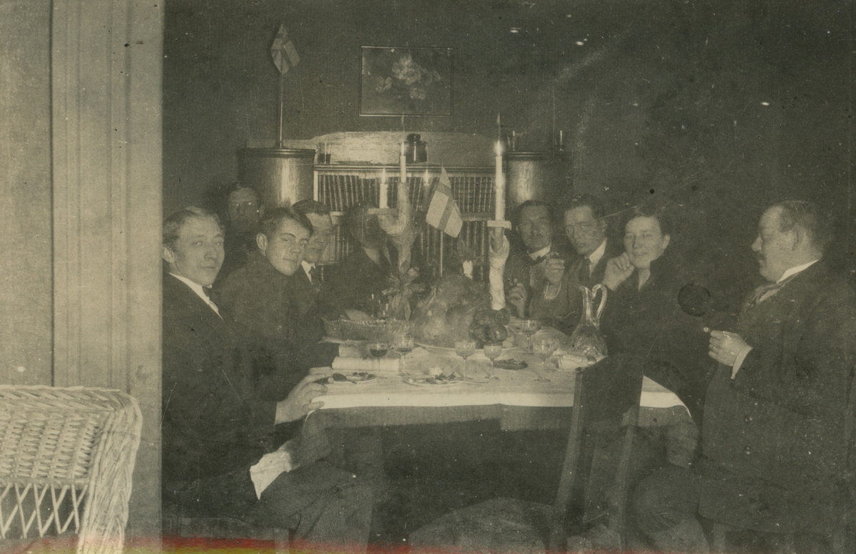 Fotografi från expedition till Spetsbergen. Motiv av åtta finklädda män och en kvinna som sitter runt ett bord och äter middag. På bordet finns ett stort grishuvud med äpple i munnen och flera vinglas, ljusstakar och en flagga.