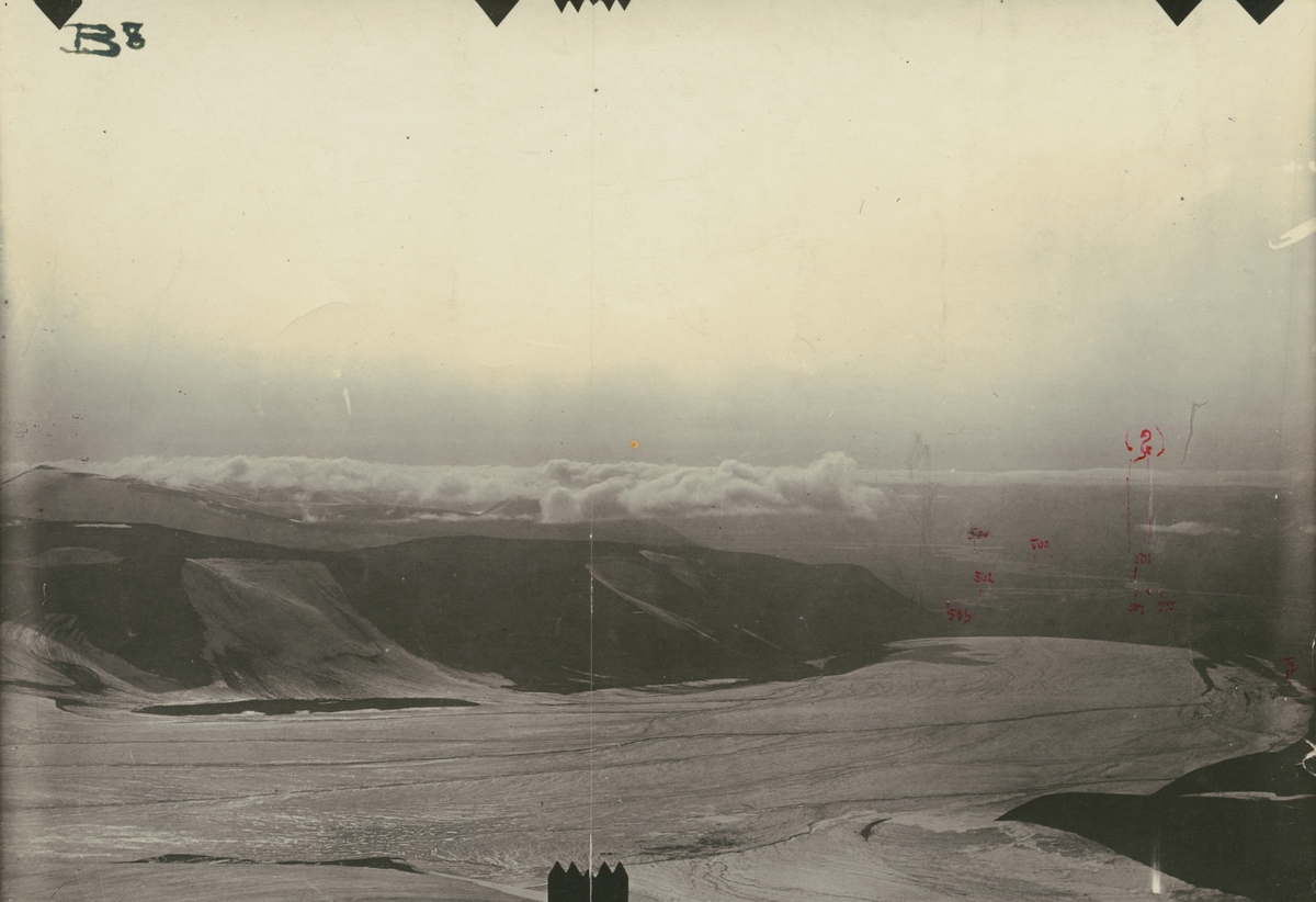 Fotografi från expedition till Spetsbergen 1920. Vy över hav, berg och himmel.