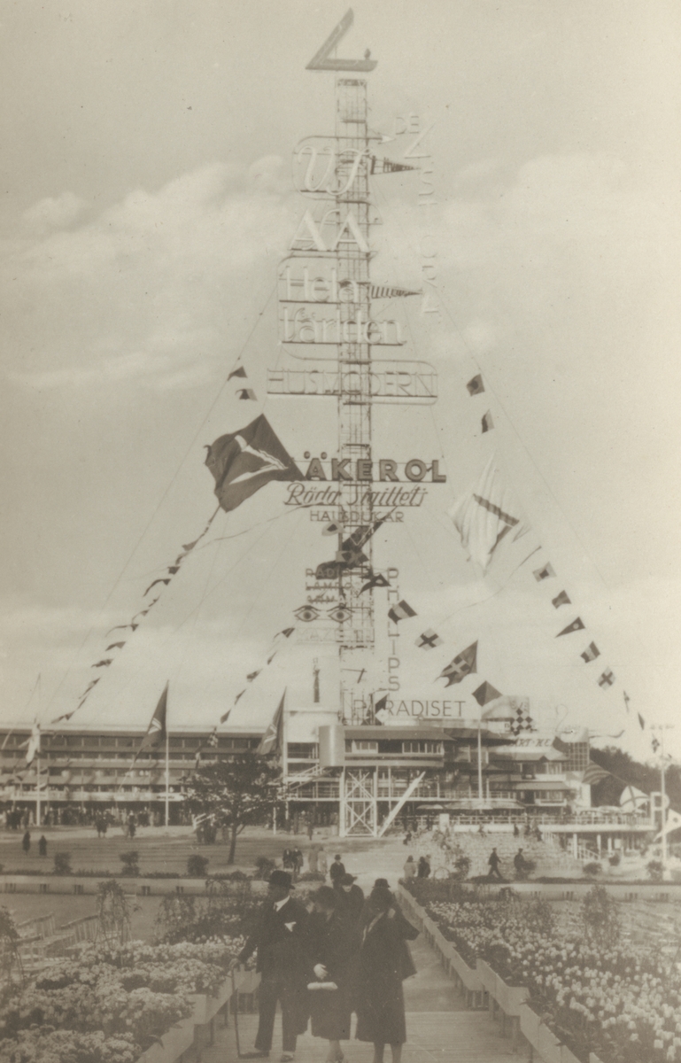 Fotografi från Stockholmsutställningen 1930. Motiv av "reklammasten" med reklam för bland annat Läkerol.