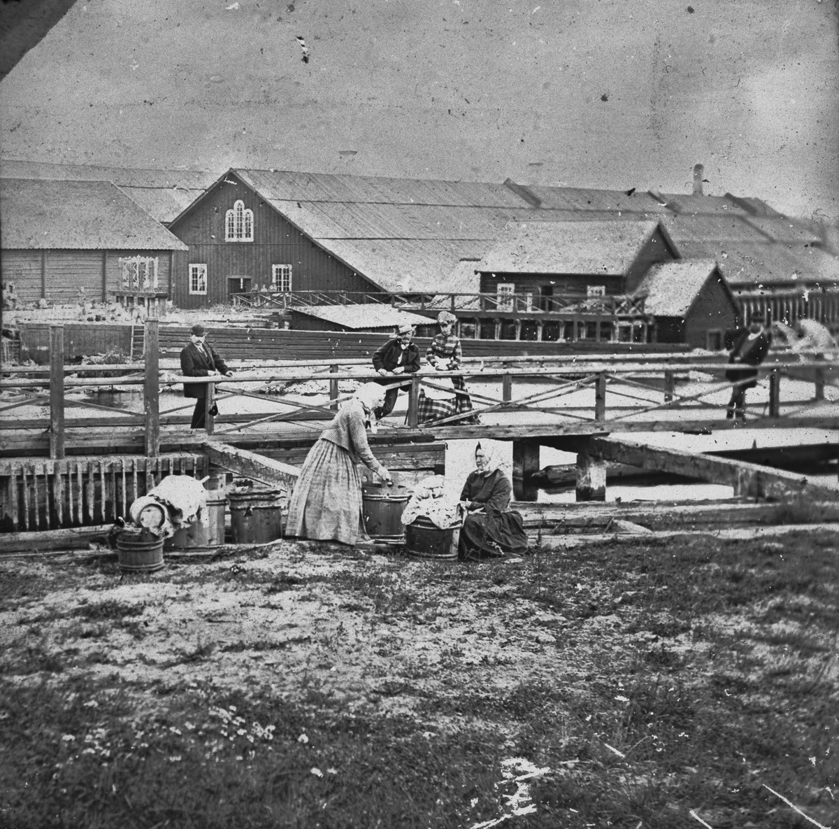 Skioptikonföreläsningserie. Gård, i förgrunden tvätterskor??
