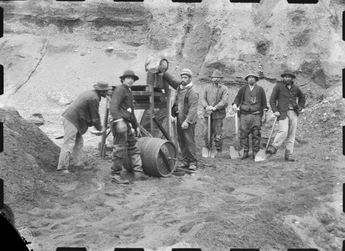 Fotografi från Eldslandet. Motiv av en grupp arbetare i stenbrott/grustag.