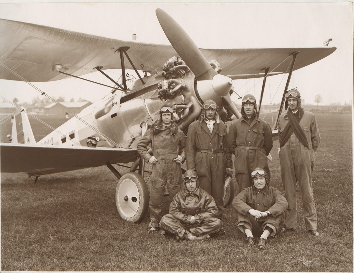 Hämtning i England av Bristol Bulldog. Löjtnant Carlgren, löjtnant Hägglöf, kandidat Söderberg, löjtnant Westling, Sporre och Ekman.