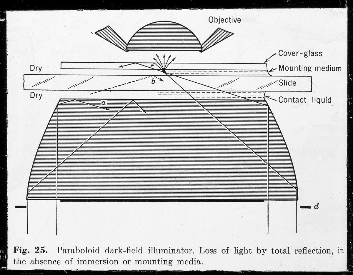 Paraboloid mörkfältsbelysning. Förlust av ljus genom total reflektion, i frånvaro av nedsänkning eller monteringsmedel.