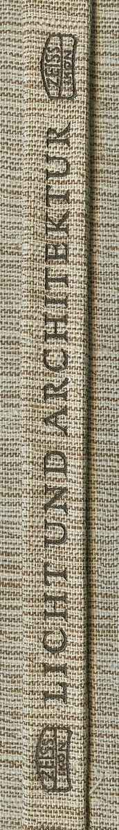 Rygg på boken "Zeiss Spiegellicht System Zeiss-Wiscott in der Architektur : eine Sammlung durchgeführter Beleuchtungsanlagen". Boken gavs ut av Berlin-Zehlendorf : Zeiss Ikon A.G., Goerzwerk, 1937.