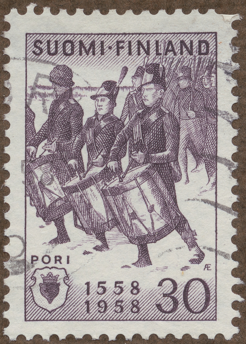 Frimärke från Finland, 1958. Motiv av Björneborgarnes Marsch (Björneborg = Pori) Finsk militärmarsch, urspr. fransk 1700-tals melodi, med text av J.L. Runeberg, som ingår i "Fänrik Ståls sägner". 400-årsminne av Poris grundläggning 1558-1958.
