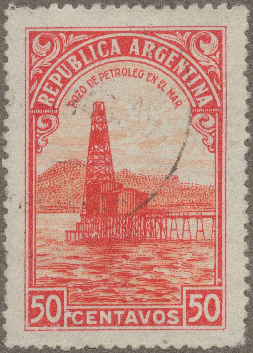 Frimärke från Argentina, 1935. Motiv av petroleumtorn i havet, Argentina.