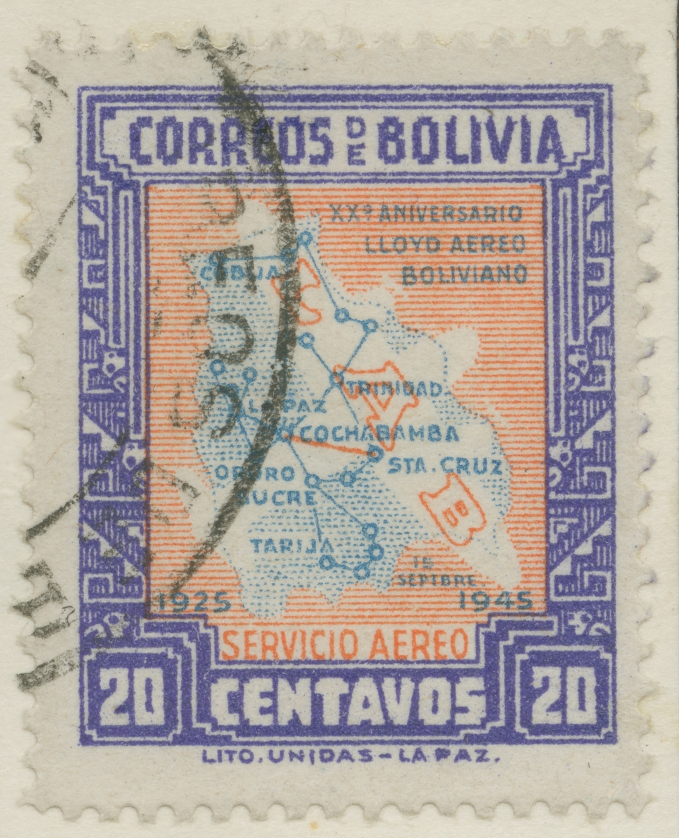 Frimärke från Bolivia, 1945. Motiv av karta över Bolivias flyglinjer. "20-årsminne av flygbolaget "Lloyd Aéreo Bolivianos" grundande 1925-1945".