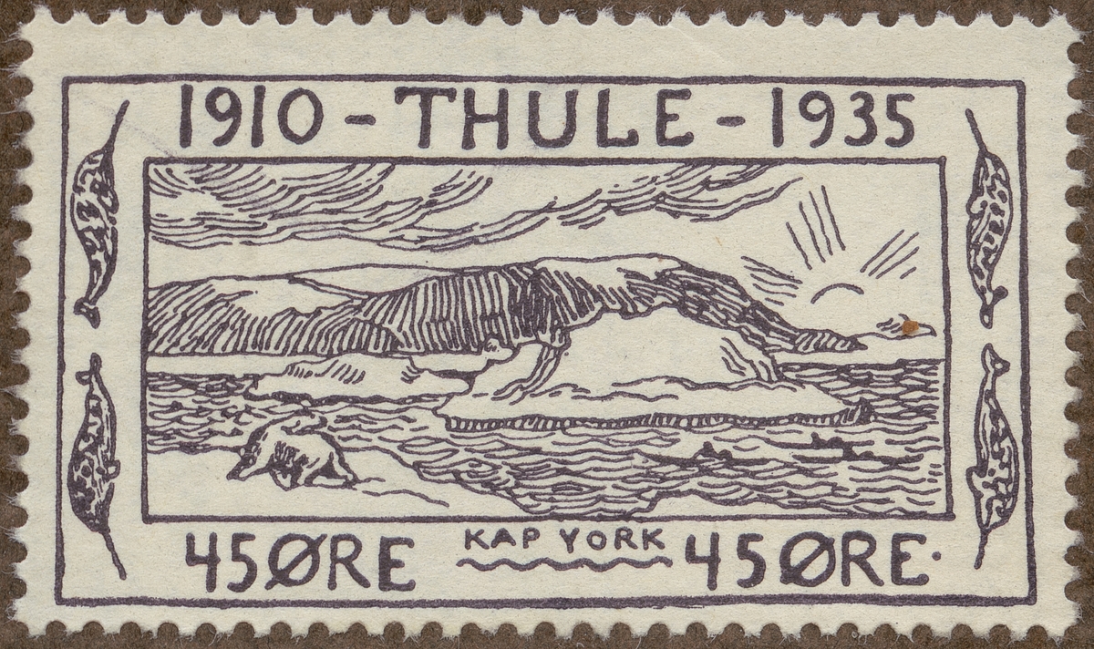 Frimärke från Thule (Grönland), 1936. Motiv av Eskimåer på isbjörnsjakt Kap York Nordvästra Grönland. Thule Kolonien 25 år: 1910-1935. Grundad av danska polarforskaren Knut Rasmussen: (1879-1933) "Thule serien-"