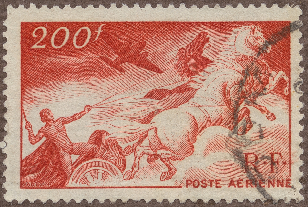 Frimärke från Frankrike, 1946. Motiv av Antikt trespann med hästar symbol för flyget