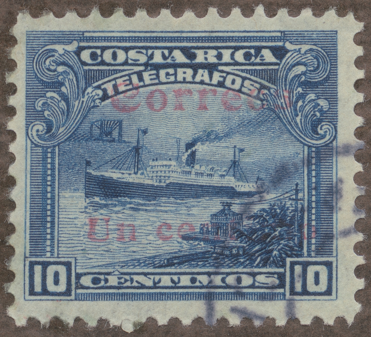 Frimärke ur Gösta Bodmans filatelistiska motivsamling, påbörjad 1950. Frimärke från Costa-Rica, 1910. Motiv av Postångare med trådlöst