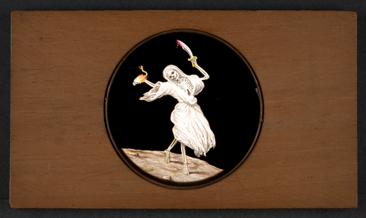 Laterna magica bild målad i färg på glasskiva.