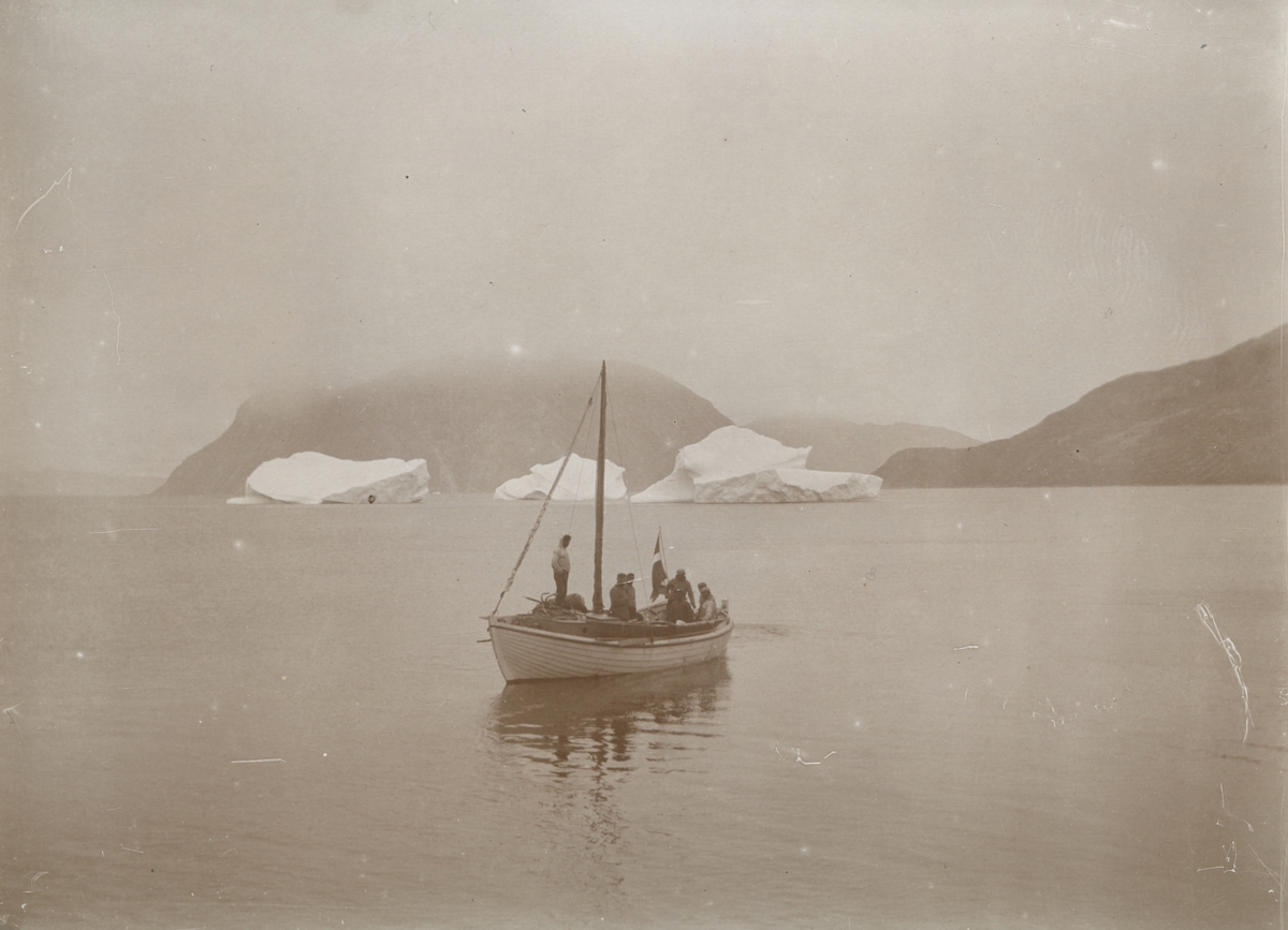 Fotografi från expedition till Grönland. Motiv av ett antal fiskare ute på havet i en fiskebåt. I bakgrunden syns tre mindre isberg.