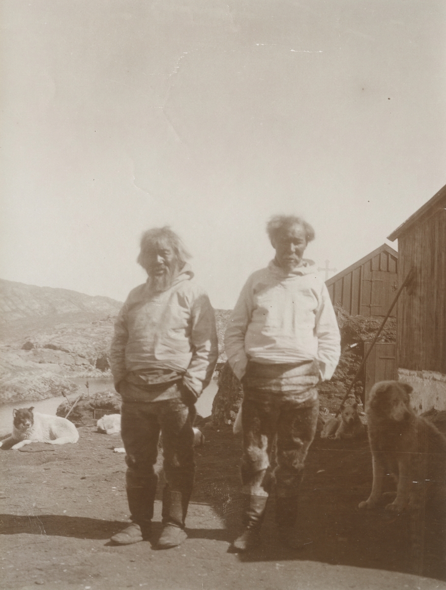 Fotografi från expedition till Grönland. Motiv av två äldre män och två hundar på ön Sarfannguaq som ligger i den sydvästra delen av Grönland.