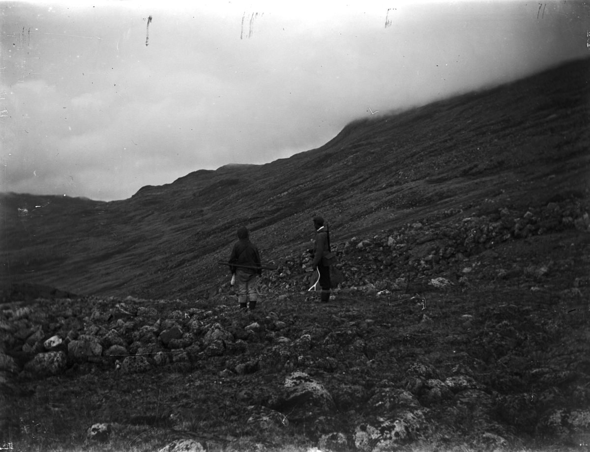 Fotografi från Grönland. Motiv av två personer i ett bergslandskap.