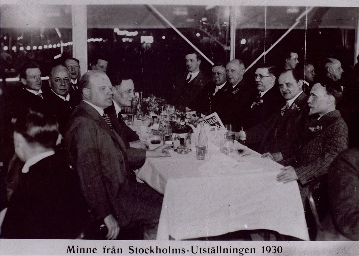 "Minne från Stockholmsutställningen 1930". Fullmätigmöte i Änke- och Pupillkassans Minnesfond 1930. Runt bordet fr.v. Gustav, Röding, Lignell, Wold, Sandström, Klasén, Wiklund, Ahlbom, Ljungqvist, Pettersson, Nygren Ideström.