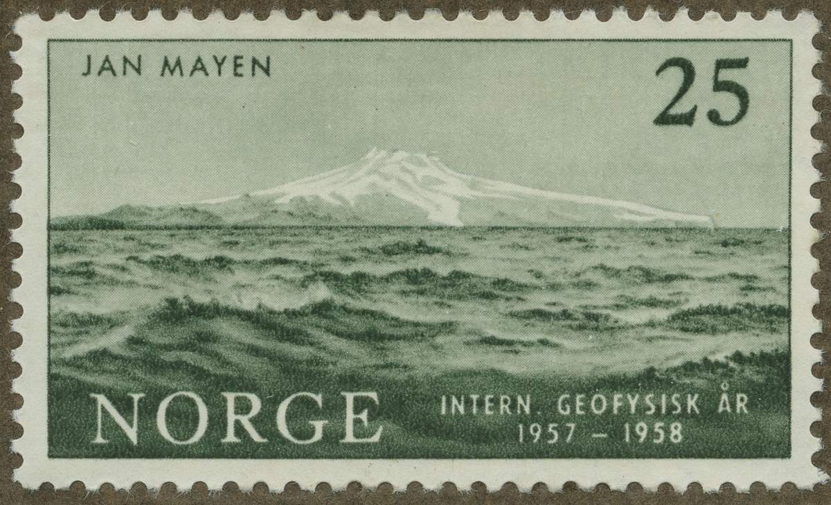 Frimärke ur Gösta Bodmans filatelistiska motivsamling, påbörjad 1950. Frimärke från Norge, 1957. Motiv av Ön Jan Mayen "Mellan Grönland och Island Geofysiska året 1957-1958"