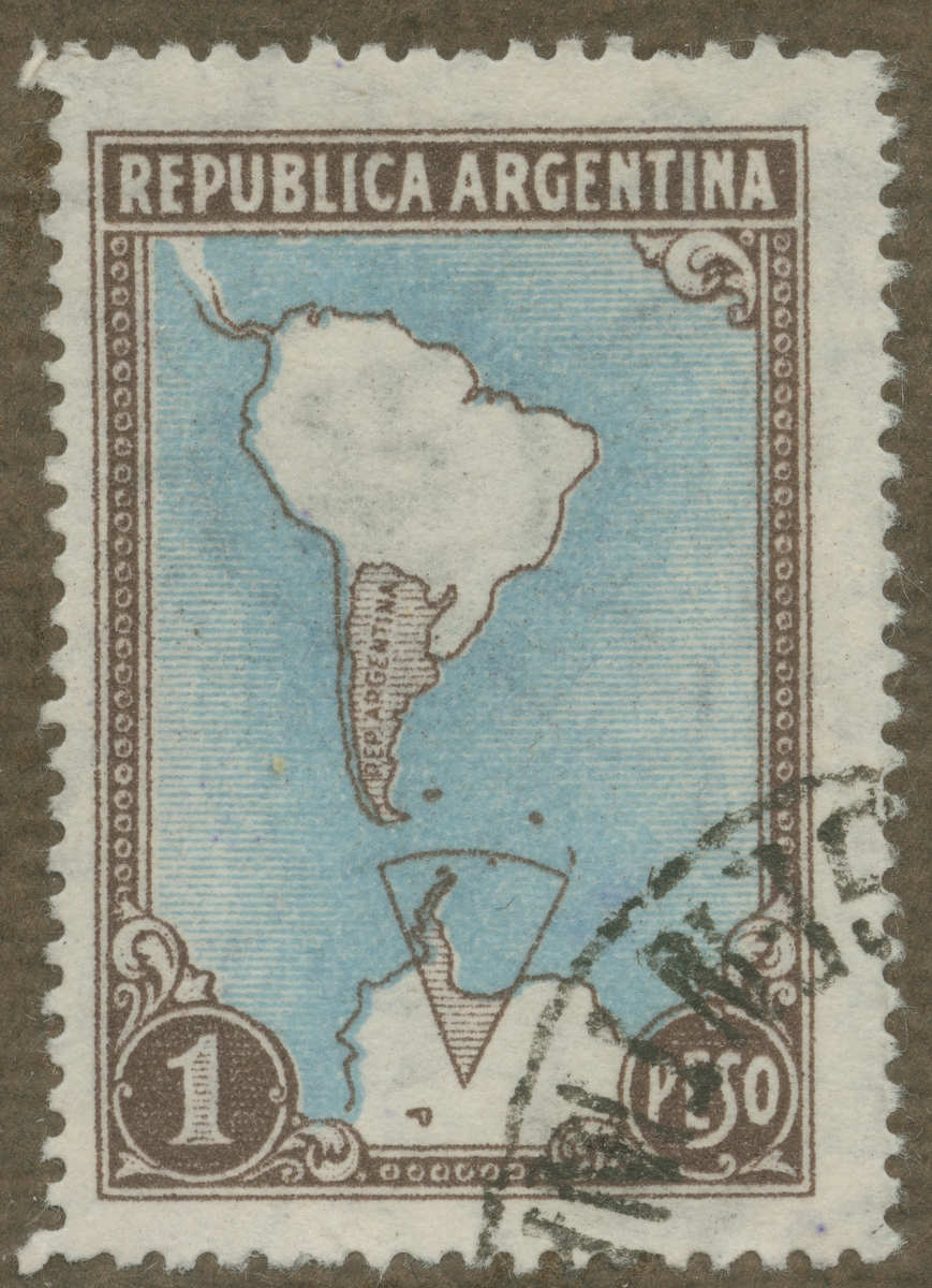 Frimärke från Argentina, 1950. Motiv av Sydamerikas karta. "Speciellt Argentina med dess pretentioner på Antarctis: Graham Land".