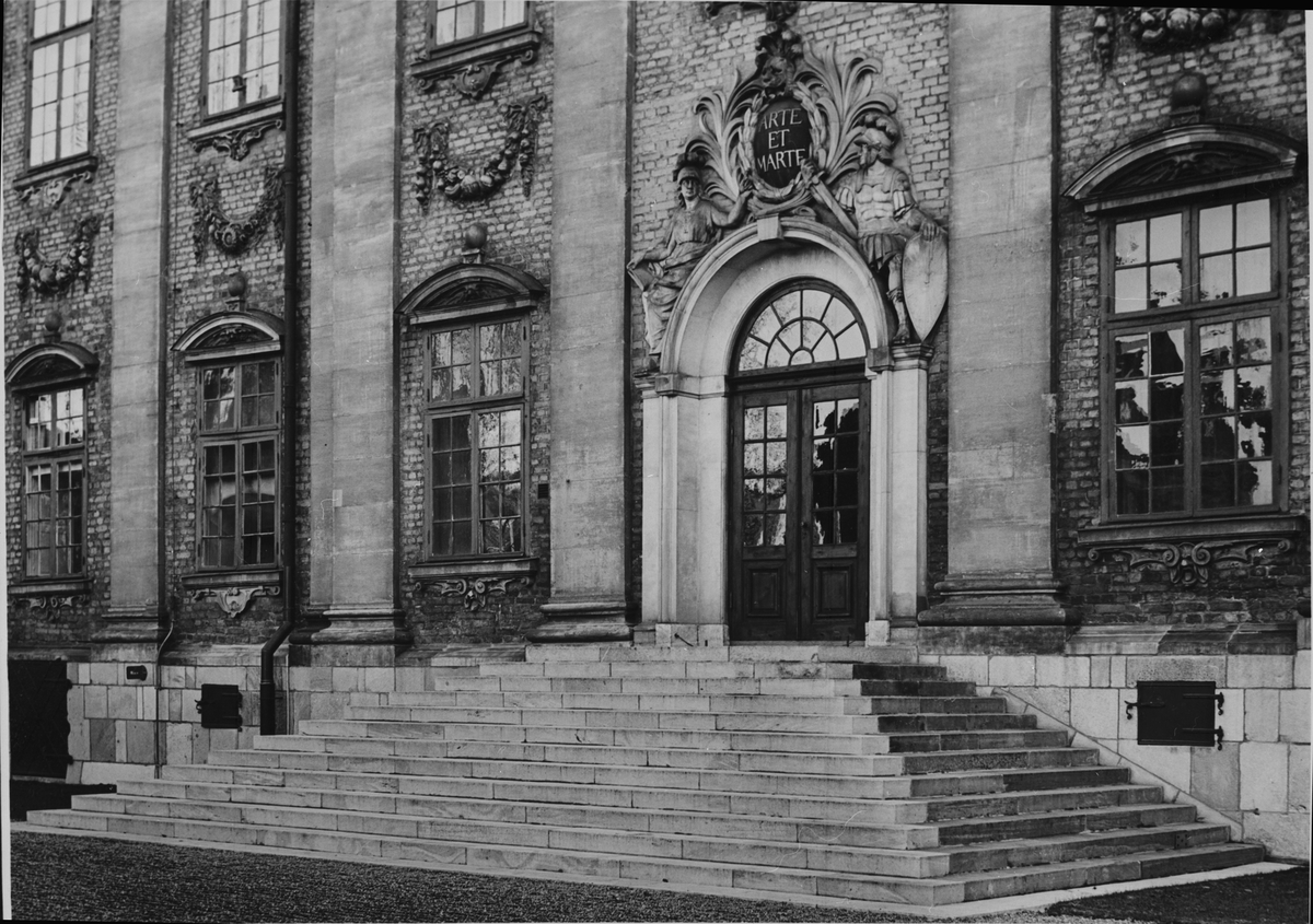Bröderna Gustafssons stenhuggerier AB, Stockholm. Portomfattningen, väggpilastrar, solbänkar, fönsteröverstycken och fruktinslagen av Gotlandssandsten. Yttertrappan av Gävlesandsten. på Riddarhuset.